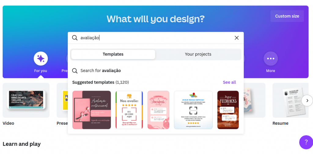 Acesse o Canva, faça seu login, e procure pelos templates de avaliação.