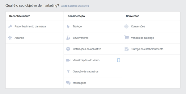 Aqui é onde toda a campanha será configurada. Começa por definir as metas, ou seja, o que você deseja alcançar com esse impulsionamento.
